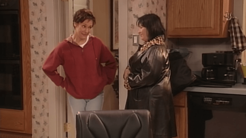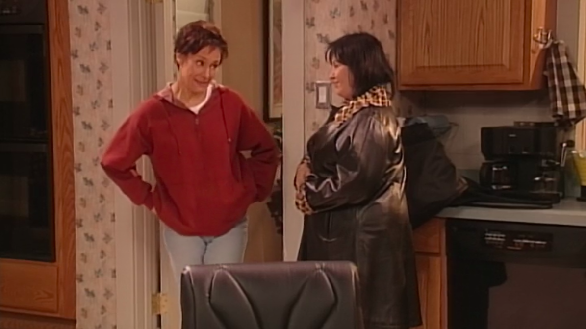Later on, at the Conner house, Jackie, sporting a shiner, and serving Black Widow a cup of coffee, asks the ultimate question about wrestling being fake. Even though she has a fucking black eye courtesy of the Black Widow. Of course, Black Widow mentions that it is fake, “for guys like Rowdy Roddy Piper.” But when women do it, it’s for real. Black Widow feels bad for Mark not getting his chance to wrestle her and they decide to arm wrestle. She lets him win, and when Roseanne shows up for the second time in this episode, she just posts up opposite the Black Widow and arm wrestles her as well. Not once questioning why the hell this giant woman in spandex is in her kitchen. Then they cue the remixed version of the Roseanne theme song by Blues Traveler as the credits roll.
