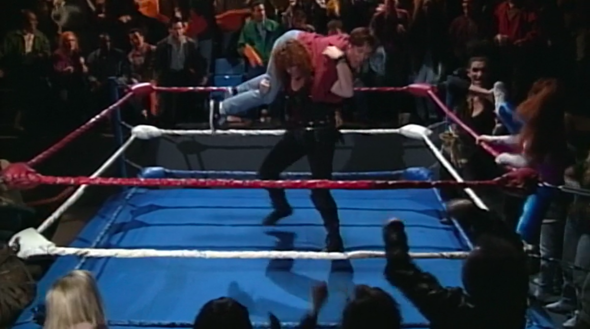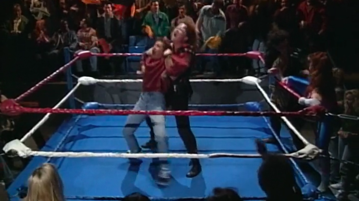 Roseanne is busy tending to Darlene after she’s had her baby, leaving room for her sister Jackie to do absolutely nothing. Becky #2’s husband Mark has tickets to a wrestling match and invites D.J. to go but little D.J., all grown up now, has a hot date to go watch Return of the Jedi. There’s another storyline about Roseanne’s fresh-out-of-the-closet lesbian mother, Beverly, double dating with Roseanne’s gay business partner, Leon, and their significant others (one of which includes the Fred Willard). Having no one to go to the wrestling match with, Mark asks Jackie because why not.