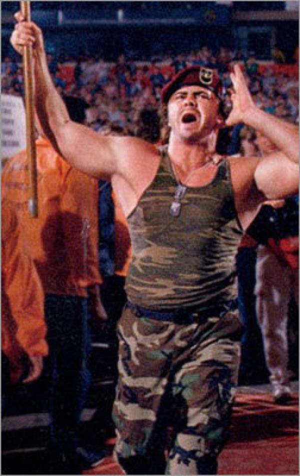 One man who kind of breathed new life into the militaristic role was WCW/NWA’s Ranger Ross, but only because he happened to be African American. Other than that, he was a pretty bland performer. He also didn’t care much for the camo attire, dropping it early on in favor of basic black trunks. He might’ve been ahead of his time with that wardrobe choice, but for a military man it just wasn’t going to do. The former U.S. Army paratrooper did carry around an American flag though, as is standard issue with this gimmick. His first major feud, as with most pro-American wrestlers was against The Iron Sheik. One of their matches even took place at the Clash of the Champions VI, in which he made his entrance rappelling from the top of the Superdome. Eat your heart out, Shawn Michaels. Now, if that doesn’t sell you on subscribing to the WWE Network, I don’t know what will.