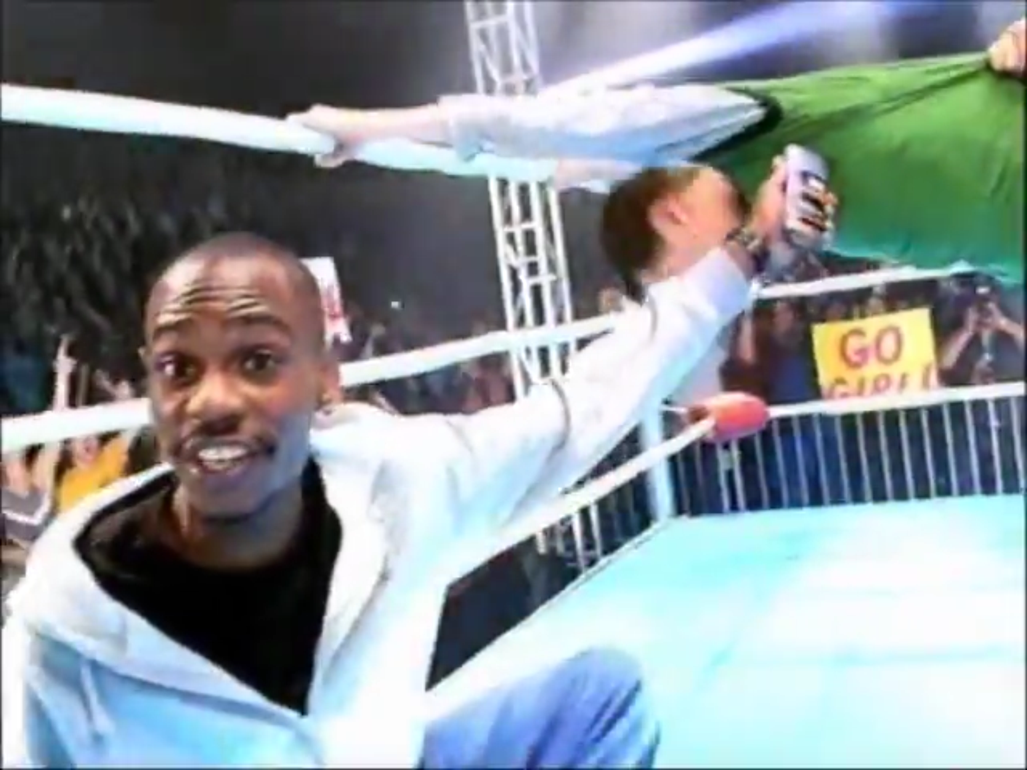 Naturally, the poor schlub gets his ass handed to him. Clotheslines from hell, double-team X-factor finisher, and a half-assed camel clutch are just the beginning. All the while Chappelle encourages the poor sap to get her number. Then we get a face-down Cesaro swing, an airplane spin, and the obligatory cartoony moves that are far-fetched. Like, the Boston Crab where you pull somebody so far back you make their feet reach their head and touch the ground. Legitimately paralyzing the poor bastard. But the deodorant is working according to Chappelle. In his defense, there were no visible wet spots under the guy’s pits. They at least they proved that right. He says it doesn’t smell, but this ain’t smellavision so we’ll have to take his word for it. It does go on clear though.
