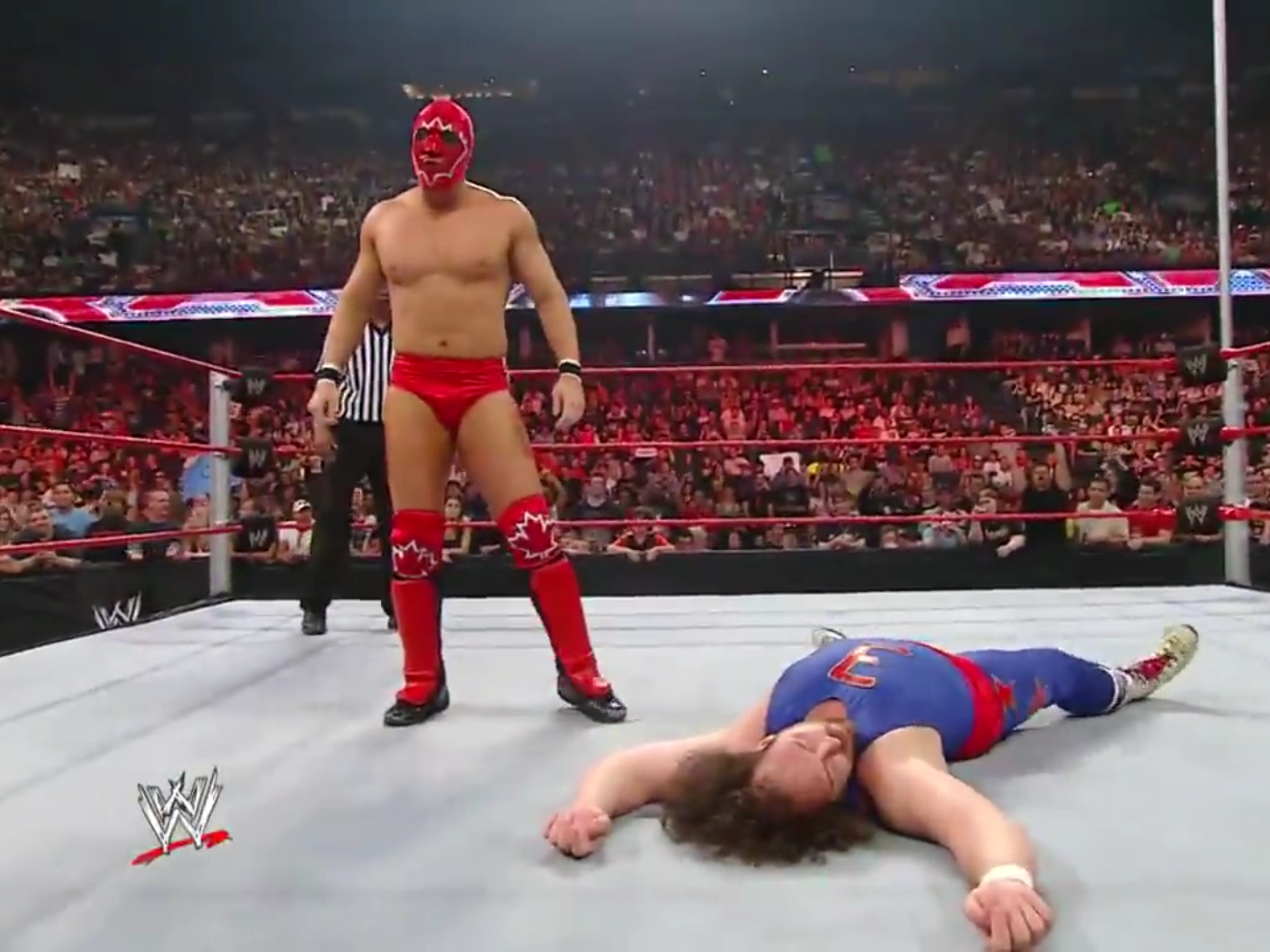 More wrestling mask loopholes! So after losing the right to challenge The Hardy Boyz for the WWE Tag Team Titles, Edge and Christian dressed up as Los Conquistadores and won the belts back from The Hardy Boyz, in order to have some jabronies (Christopher Daniels and Aaron Aguilera) dress up as Los Conquistadores so Edge and Christian could beat them and officially win back the titles. But, the next night on Raw, The Hardy Boyz jumped the other fake Los Conquistadores and beat Edge and Christian in order to retain the belts as Los Conquistadores, but really win them back as The Hardy Boyz. Despite this version of Los Conquistadores doing very little to hide who they really were by performing signature Hardy Boyz maneuvers, the crowd still popped big time after they unmasked themselves to be The Hardy Boyz. Because being a wrestling fan means being in on the joke, but going along with it nonetheless. This is probably the only time the WWE Tag Team Titles changed hands while the same “team” remained champions.