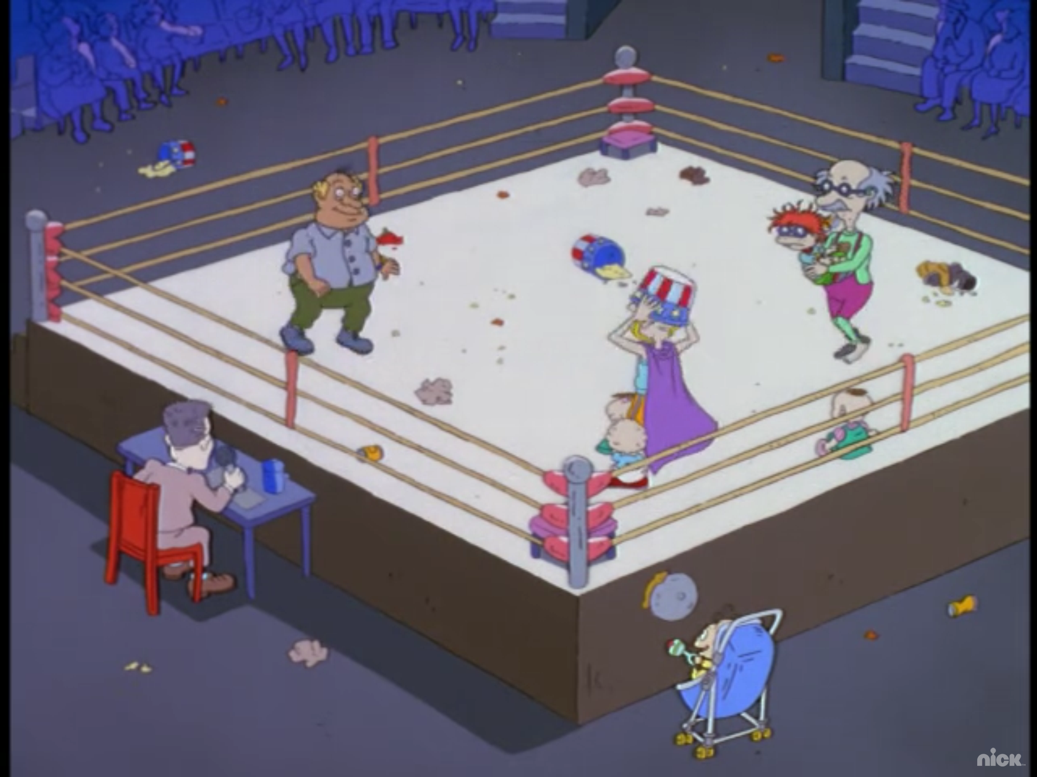 The kids think the food will help Pretzel-Maker regain his strength, but when they realize all it’s doing is making a mockery of something he once held dearly to, they decide to take to the ring and help him out. As they climb inside the ring, the announcer, having never seen babies before, proclaims them to be tiny wrestlers. Tommy and Lil put a bucket of popcorn over McNulty’s head, and they start attacking him, like a pack of demon spawn. Apparently, this is a no-disqualification match because the referee is allowing all this to happen. Terry Funk has nothing on these hardcore geriatric wrestlers. Pretzel-Maker, fearing for the well-being of the children (not sure why), decides to call it quits and put an end to the elderly abuse.