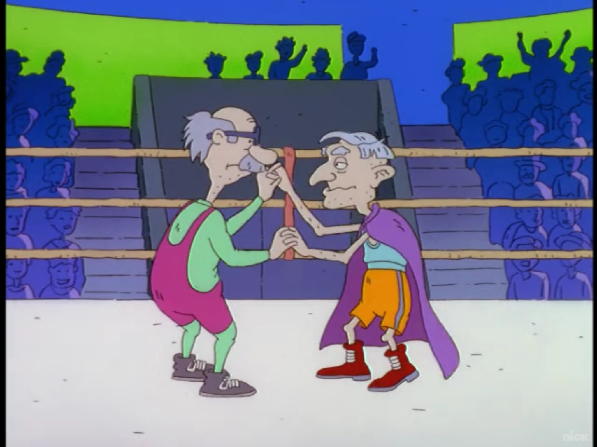 Grandpa then explains to the kids how he used to be the wrestling “champeen” back in the day, around the time Tommy’s dad, Stu, was born. And he just happens to have a match scheduled for that same night on the same show he’s currently watching on TV. Must be one of those terrible three hour wrestling programs. Grandpa adds that he’s wrestling his archrival, Conan “The Crusher” McNulty, for the Senior’s Division Title, which very well could be the WCW World Title given the year this episode aired (1999). Zing!