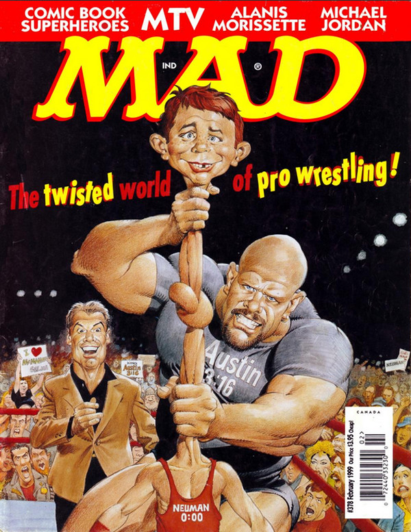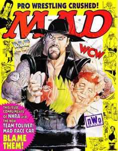 One of the few issues on the list that only features a single wrestler, which is saying something when the only other two to be featured individually are Hulk Hogan and Alfred E. Neuman as the Ultimate Warrior. Technically, there are other drawings of wrestlers in the background, but Undertaker is upfront and in color. This came out during the Monday Night Wars that gave wrestling it’s second boom period. The thing is, it’s a pretty tame cover for the Attitude Era. Undertaker should’ve had Alfred E. Neuman nailed to his cross-like symbol, or something. Okay, maybe that’s a bit much for even MAD Magazine.