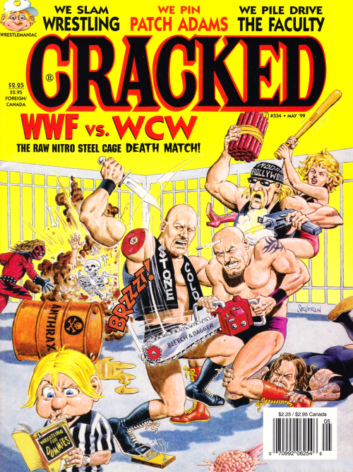 I’ll give it to Cracked Magazine for putting out a cover that really personified the crazy-ass point in time that was the Monday Night Wars, and more specifically the Attitude Era. You got some of the most famous players from each organization beating the crap out of each other in the most era-appropriate, hardcore of styles.