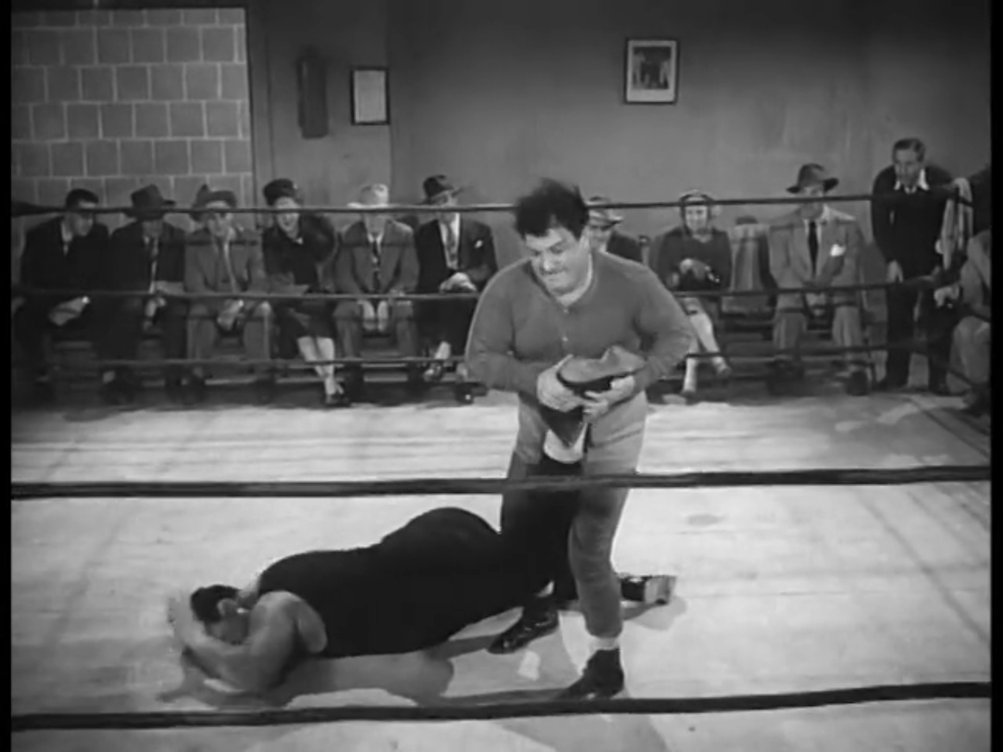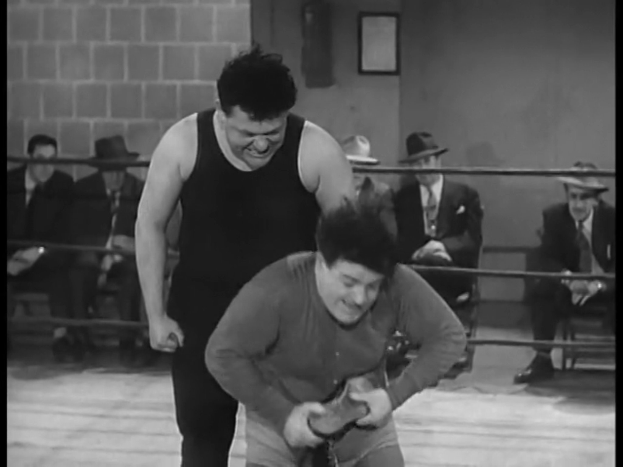 Finally, we get to the wrestling match. Before the bout starts, Lou is informed that he won’t be wrestling Stinky, but instead his brother, “The Goliath of the Mat” Ivan the Terrible. Naturally, he’s much bigger than Lou. The match itself takes place in some kind of gym. And not a high school type of gym, but more along the size of a Curves gym. It’s small, is what I’m trying to say. The ring is really just a mat laid out on the ground with some posts at each corner attached to some ropes. The spectators are are dressed to the nines, mostly because it’s the 50’s and that’s how everyone dressed when they went out. Even to a wrestling charity event in someone’s basement.