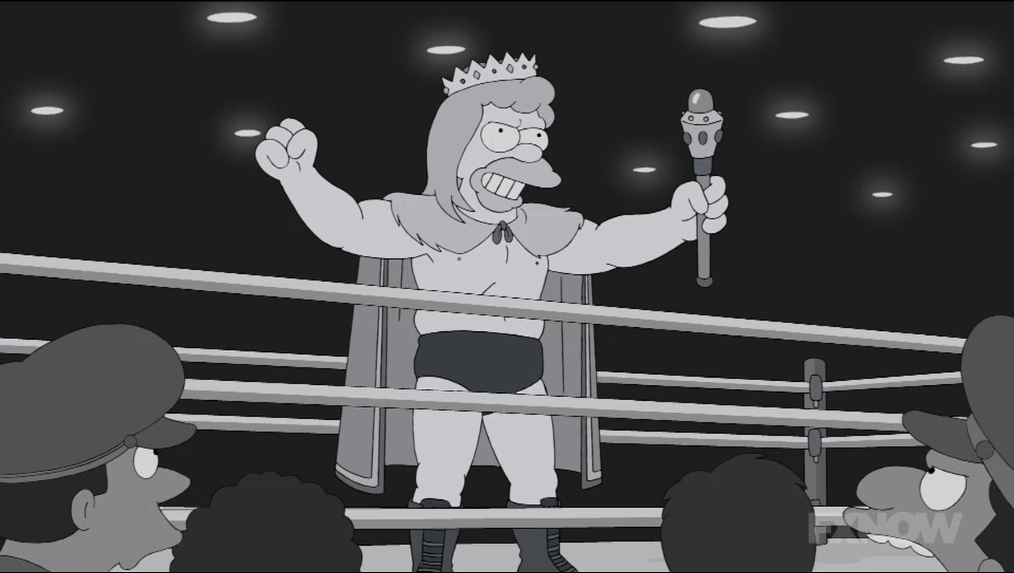 Bart, who’s now in awe of his grandpa, also tags along for the free meal, and marks out even harder when Grampa finally goes into some of his old school battles with the likes of Olaf Johannsen, “The Fury of the Fjords,” and how he pulled the ol’ getting a beauty treatment during the middle of a match trick in order to get the jump on Johannsen. Burns begs Grampa to put the wing on once more and return to the ring, holding true to the notion that wrestling fans love seeing old wrestlers perform for nostalgia sake, no matter how out of shape or old they are. But Grampa is dead set against being hated again.