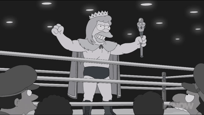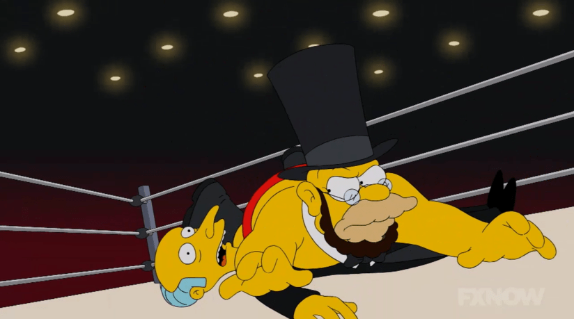 Grampa grabs the mic and pulls a One Man Gang/Akeem switch, declaring Glamorous Godfrey dead, and in his place, Honest Abe, which he emphasizes with a slapped-on beard and stove pipe hat. Before Bart can even question him, Grampa transforms Bart into Laddie Liberty. Burns berates them and goes so far as to call Bart a “morbidly obese little half-wit,” proving no heel can match Mr. Burns when it comes to talking trash. Grampa responds by finally employing some of his God-given wrestling skills. He gives Burns the tried and true airplane spin, then follows it up with moves that he most definitely did not use during the Golden Age of Wrestling, like a power bomb, and finally, a splash off the top rope. He then lets Bart finish him off with an elbow smash, followed by the three count. And for the first time in his wrestling career, Grampa Simpson hears the overwhelming sound of cheers. Something WWE is still trying to accomplish with Roman Reigns to this day.
