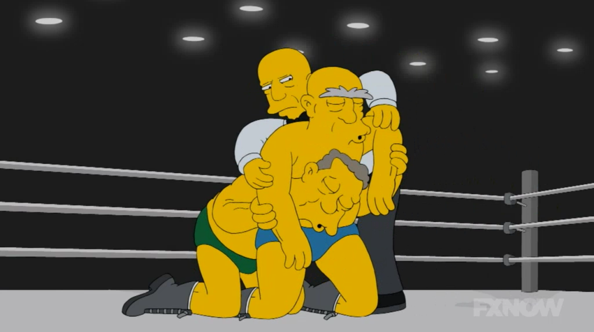 The Simpsons family tag along to witness Grampa’s grand return and, still impressionable after 24 years, young Bart is overjoyed that his grumpy old Grampa was really a psycho wrestler all along. Meanwhile, Lisa looks through the program guide for this particular Golden Age of Wrestling event, which includes the names of such greats as Gorilla Joe, Gorilla Sam, Gorilla Pete, the Gorilla Twins, etc. But sadly, no Gorilla Monsoon reference. Once inside, Mr. Burns welcomes everyone to some “senior on senior action,” but instead of getting Nick Bockwinkel vs. Dory Funk Jr. from Slamboree ’93, we get two elderly grapplers falling asleep midway through, you guessed it, a rest hold. Even the referee knocks out.