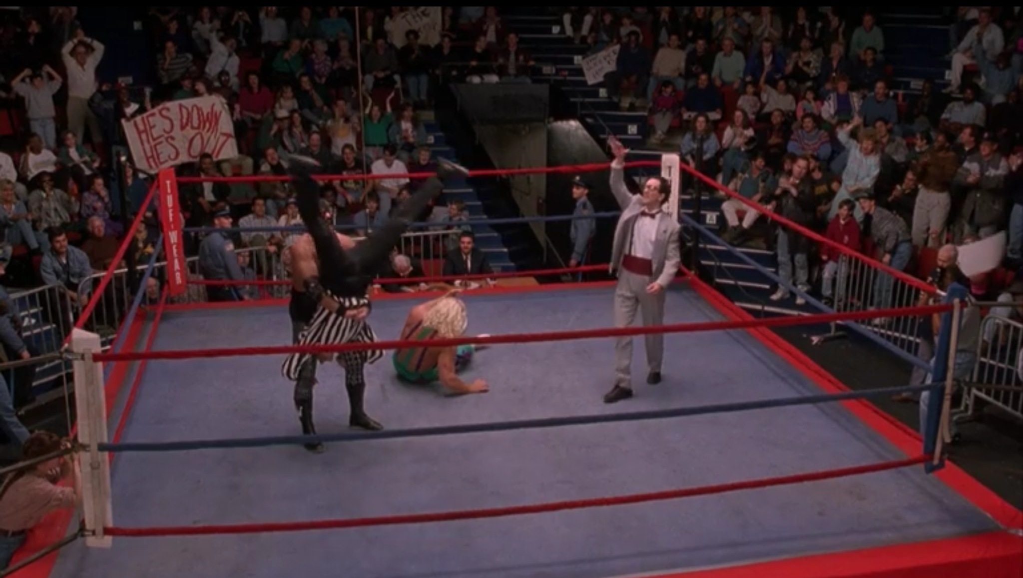 We then get back to the ring where The Lobotimzer throws Evil Eye into the ropes to set him up for a back drop. It’s a high impact move that always looks great on film. Props to the film’s stunt team for thinking outside of the airplane spin box. He then follows that up with a bodyslam, which yeah, are a dime a dozen in movies featuring wrestling, but it is a staple of the foundation of all pro wrestling move sets. BUT it’s never a damn finisher. That’s right. The Lobotomizer puts Evil Eye away with a freakin’ body slam. The ref counts to three, as does everyone else as they cheer the outcome. Which is weird, because based on his look and actions, you would think The Lobotomizer was the heel, but Evil Eye does have the word Evil in his name.