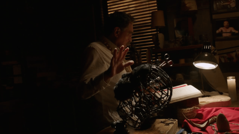 The detectives disrupt Rosalee and Monroe’s nice night in and get them to come to Benito’s shop to perform the ceremonia de disgracia. Amidst a make-shift circle of lit candles, the guys pin Goyo to the ground, while Rosalee mixes up some herbs and spices in a boiling thermos. She claims she has to pour it on Goyo’s face as it’s the only way to get it off. She does as directed, and Goyo convulses and yells until he passes out.