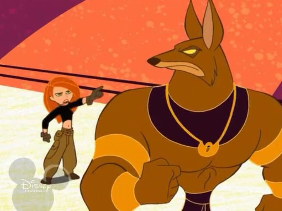 Kim shows up at Ron’s place, who’s busy watching old tapes of Wrestling Wriot with Rufus, because it’s only 2002 and the GWA Network isn’t a thing yet. Kim tries to explain what happened, but gets a call from Wade, who she had phoned about the museum robbery before showing up to Ron’s, I guess. He tells her that the only thing that was stolen was a small talisman, a gift to Cleopatra, from the high priest of Anubis, and something about a mummified jackal, or something. I didn’t quite make it out that last part. But Wade did add that the talisman was “enchanted” with super human strength. Kim finally lets Ron know what’s going on, but he’s hung up on the fact that Kim hung out with Monique, instead of him.