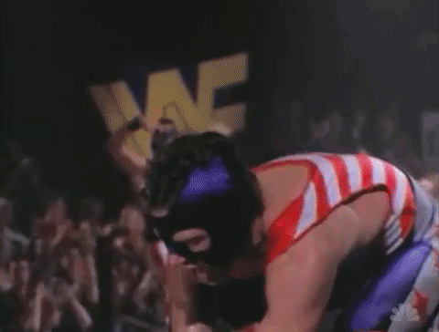 We then see the Yankee Dudes in action, who are now sporting Aldo Montoya-brand jockstrap head gear to go along with their outfits. The Dudes make quick work of their opponents, which ends with Paul Severe delivering his patented finisher, The Patriot Missile. This consists of Wyatt backflipping from the top rope, in what you initially think might be a moonsault, only for him to land in a seated position as he delivers an elbow smash. It’s basically a complicated flying elbow smash.