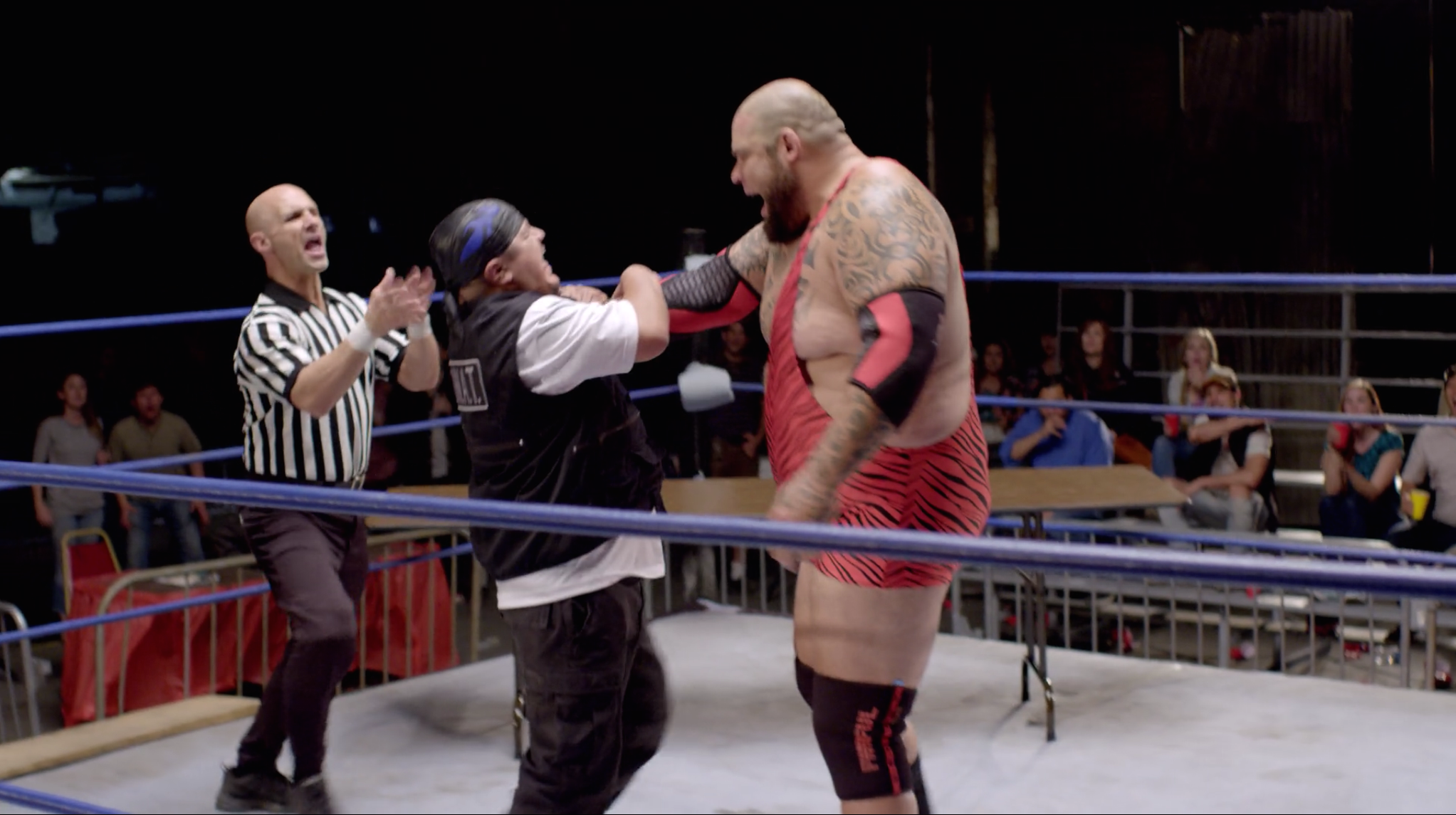 We then get a brief montage of how fun indie wrestling shows can be. There’s more in-ring action, Chris and Bertie chugging beers, Mando Guerrero on commentary (I guess Netflix is contractually obligated to work with Guerreros for any original shows that feature wrestling), Colin performing a lucha arm drag on Canales, Mayday Marge entering the ring, then taking on Gail Kim, and then taking their fight to the outside and, as a result, unleashing Bertie’s blood lust, as she screams “Kill her! Fucking kill her!” I’m not sure who she’s directing this to, but as soon as she says it, Gail Kim takes a terrified old man’s walker and nails Marge in the back. So her yelling definitely didn’t go unheard. Oh yeah, Christopher Daniels is also the referee for all of these matches.
