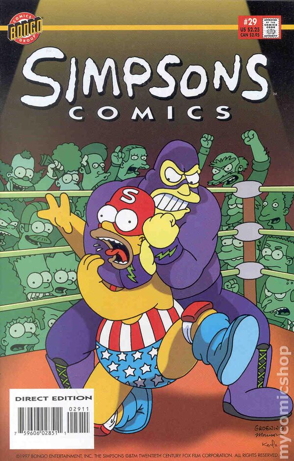 So far, it seems like children’s comic books like to throw in a wrestling storyline somewhere between issue 25 and 29. The Simpsons comic is no exception. Here we see Homer finally don a wrestling outfit, seeing as we we’ve been robbed of it in all the Simpsons episodes that have shown wrestling. Not surprisingly, he goes with a USA ensemble. He is, after all, what most people perceive to be your typical American pro wrestling fan. It’s hard to tell who the grape colored masked wrestler is (seeing as he isn’t one of the top 10 Simpsons wrestlers), but he definitely has a mean streak that overcompensates for his outfit. The world of The Simpsons is so big that having faceless half circles as the audience would’ve been a disservice to the series, so it’s cool that the artist decided to draw attention to a few of the show’s central characters.
