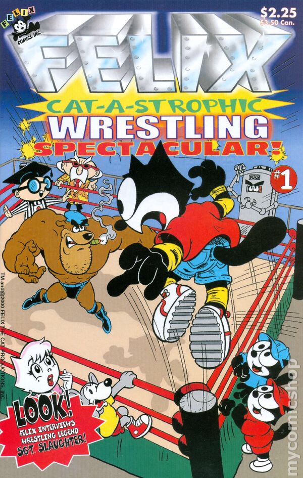 Felix the Cat was another in a long line of animated cats, and probably the oldest. But will always be remembered for being mistaken for the classic cat clock that everyone had at one time or another. Here he is taking on his fight forever rival, the animated dog. Although, for whatever reason, there’s a cartoon mouse that’s in Felix’s corner, which defies logic as far as cartoon rivalries go. Maybe he’s planning to turn against Felix mid-match. There’s a lot going on here, including a referee with a graduation cap, an anthropomorphic water heater, and a blurb at the bottom that promises an interview with wrestling legend Sgt. Slaughter somehow conducted by Felix himself.