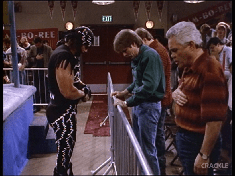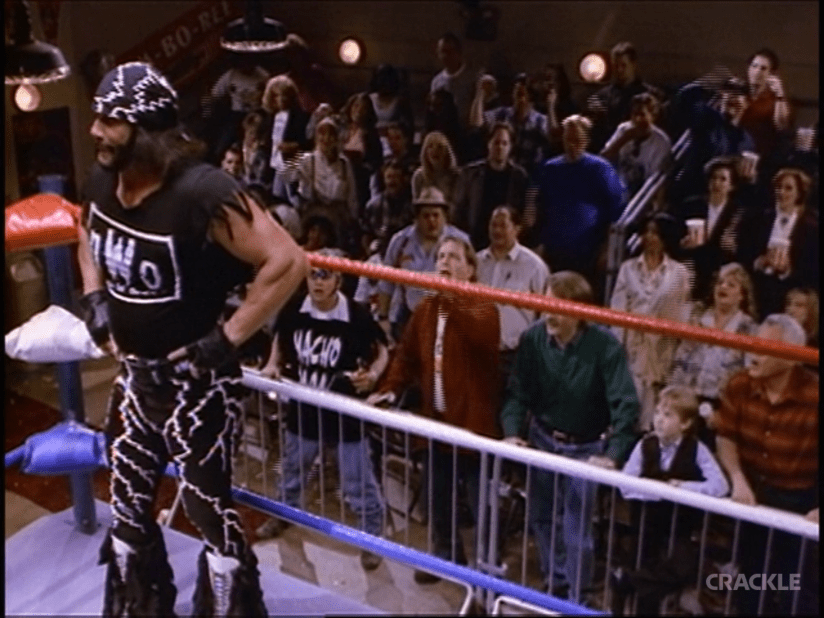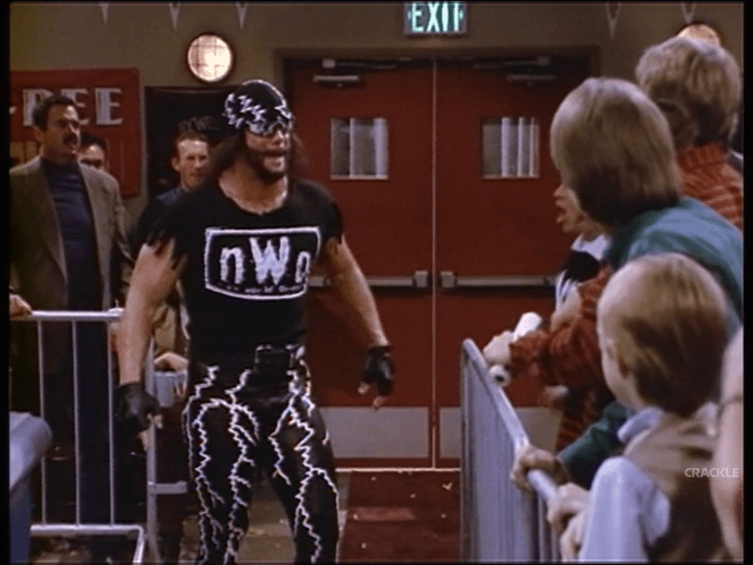 Yes. It’s the one and only “Macho Man” Randy Savage. Weirdly enough, Macho Man was making more TV appearances during his WCW/nWo era run than he ever did when he was with the WWF. Then again, said appearances were on shows like, The Jeff Foxworthy Show and The WB’s Nikki. Unfortunately, we don’t get to see Macho Man’s opponent, Spider-Head, aside from his legs. I guess the show would’ve rather had Eric Bischoff make an appearance. You’re telling me they couldn’t get Kenny Kaos for at-scale pay to eat a pin for the Macho Man?